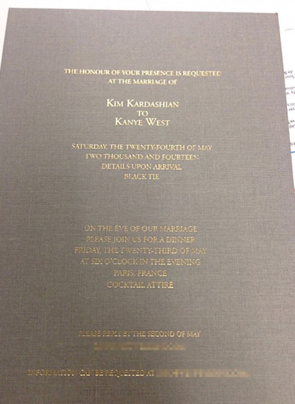 Kanye West e Kim Kardashian vão dizer o “sim”em Paris no dia 24 de maio, conforme se pode ler no convite de casamento.